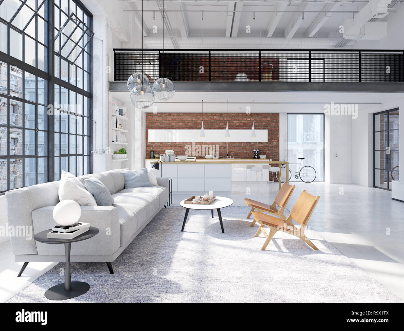 3d Rendering Loft Apartment Mit Wohnzimmer Und Kuche Stockfoto